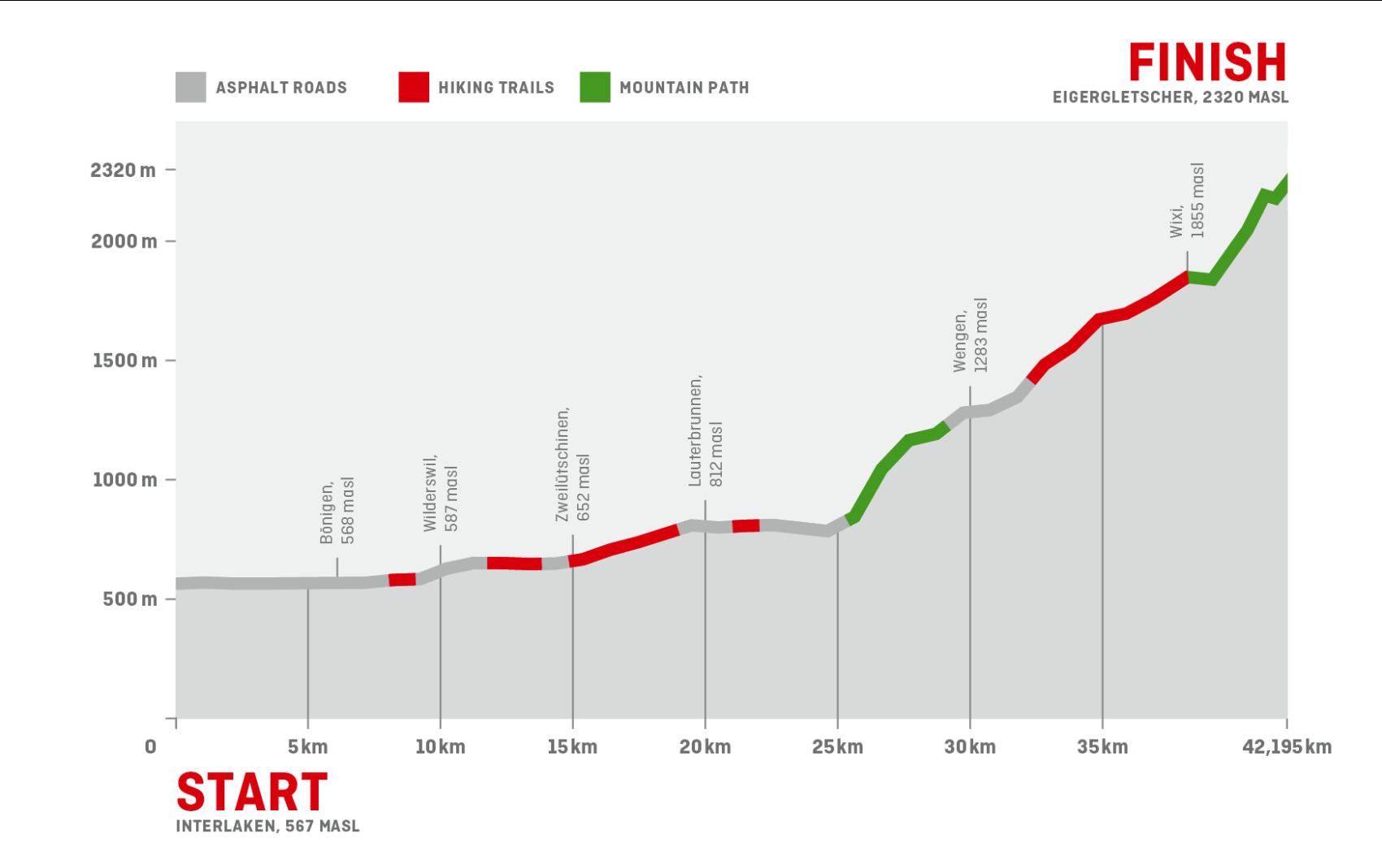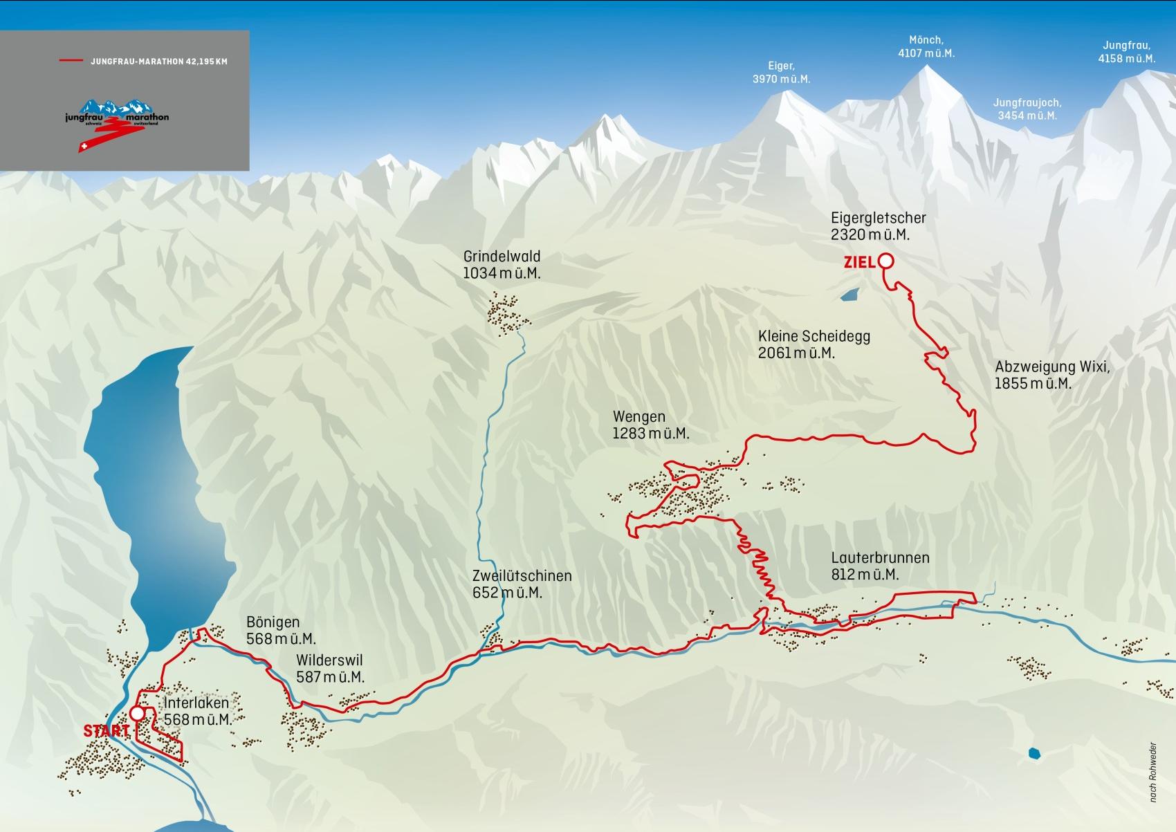 De Jungfrau Marathon staat bekend als een zware marathon waar u vele hoogtemeters loopt. In totaal 1800 hoogtemeters zitten verstopt in het parcour van deze bijzondere marathon. De start is in de stad Interlaken en de finish ligt bergop, op de Kleine Scheidegg. Vergeet niet te genieten van het prachtige landschap tijdens deze uitdaging. Hieronder is de coursemap te zien.